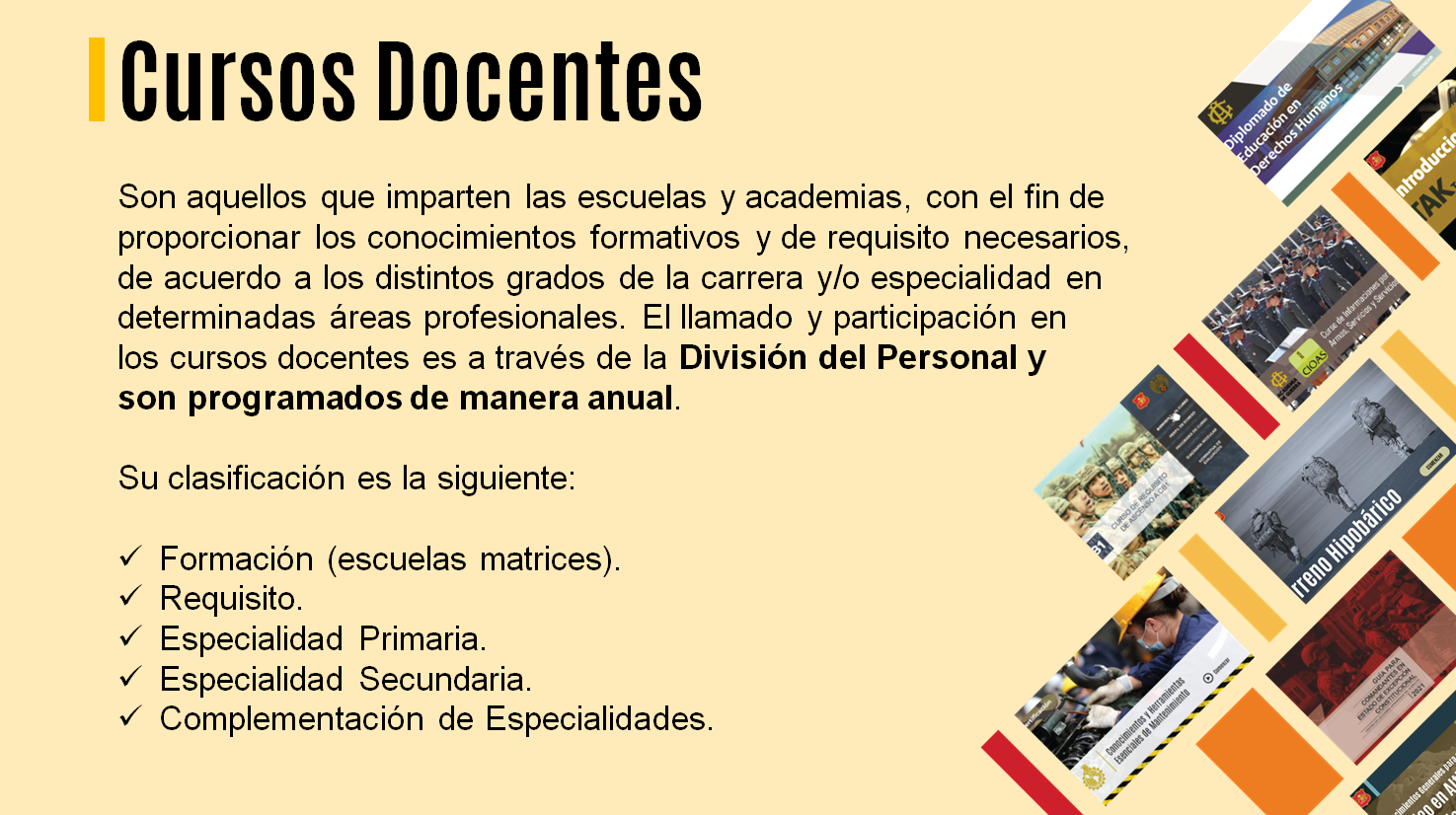 Son aquellos destinados a impartir conocimientos en un área o disciplina militar determinada, para habilitar al alumno a desempeñar funciones específicas y su realización será conforme a las necesidades institucionales.